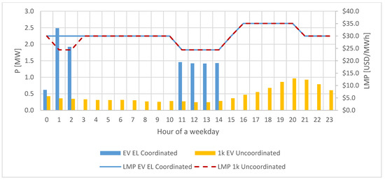 Comparison of the EV coordinated and EV uncoordinated charging profile power (P) in MW (left axis) and their corresponding system LMPs in USD/MWh (right axis).
