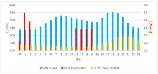 Comparison of the system load (L) in MW (left axis) against the EV coordinated and EV uncoordinated charging power (P) profiles (right axis) of 1000 EVs.