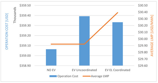 It is interesting to compare operating costs and LMPs for each of the cases. In Figure 18, the operation cost is shown in the blue columns associated with the primary y axis on the left. In addition, in Figure 18, the average LMP is shown by the orange line related to the secondary y axis on the right. In this figure, the left column is for the system operation with no EV with a cost of 359,060 USD, the central column is for the system operation with uncoordinated EV charging with a cost of 359,390 USD, and the right column is for the system operation with coordinated EV charging with a cost of 359,330 USD. Thus, as shown by comparing the central and right columns with the left one, the addition of the EV load increased the system operation cost. However, the EV coordinated charging profile (right blue column) led to lower operating costs than the uncoordinated charging profile (central column). At the same time, the daily average LMP increased slightly (in 0.47 USD) with coordinated charging (right line). This is not uncommon in power system operation; average LMPs can increase while system operating costs decrease.