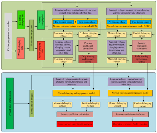The idea of fault warning in an EV charging process is to obtain all physical quantities of all types of EV during charging through charging piles and store them in a database. According to the unique code of an EV and using the historical charging data of this EV in the database, the deep learning network model belonging to this EV charging process is constructed. The real-time physical quantities of EV charging are obtained and input into the constructed exclusive deep network model to obtain the desired prediction data. The correlation between the predicted data and the actual measurements is observed to determine whether there is a fault in EV charging, thus realizing fault warning for the EV charging process. The fault warning of the EV charging process can effectively avoid charging safety accidents caused by high charging voltage, high current or high temperature. The charging process of the EV and its warning diagram are shown in Figure 1.