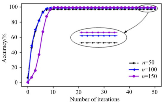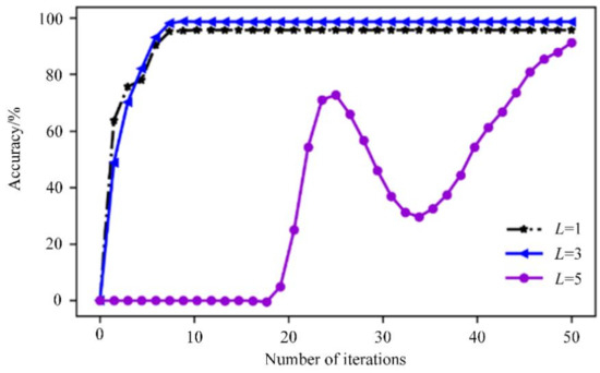 In order to study the influence of the number of hidden layers on the accuracy of charging voltage fault warning, the ADBN1 networks with L of 1, 3 and 5 are constructed. Set the number of units in the hidden layer of ADBN1 to 100 and test with conducted with the same historical normal data and fault data. The accuracy of ADBN with different hidden layers is plotted with the number of iterations as a curve, as shown in Figure 4.