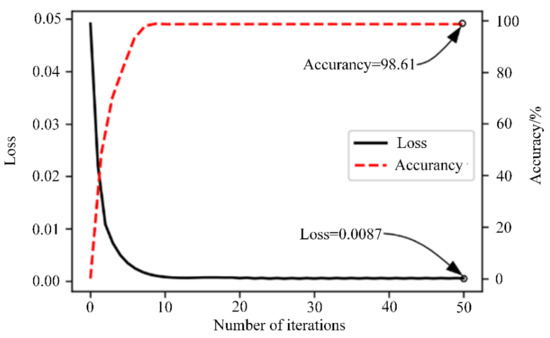 Figure 6 shows the change curves of the ADBN1 loss value and accuracy with the number of iterations in the fine-tuning stage. It can be seen from the observation curve that the loss error decreases rapidly from 0 to the 5th iteration, and gradually tends to a stable value after 10 iterations. Finally the loss error reaches 0.0087 at 50 iterations, and the average accuracy of voltage fault warning reaches 98.61% and stabilizes at this time.