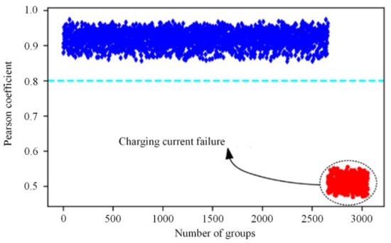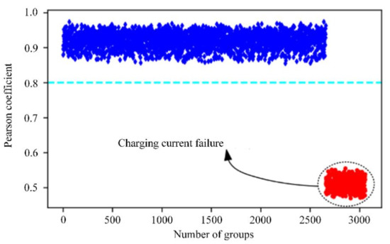 In this paper, Pearson’s correlation coefficient is used as the discriminant condition for fault warning of the EV charging process, which is used to measure the degree of linear correlation between the predicted value of the model and actual measured values [21]. When the correlation between the predicted value and the actual measured value is low, it indicates that a fault may occur in this charging process, and its expression is: