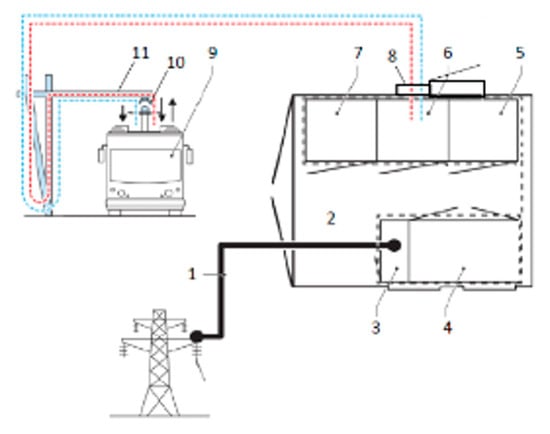 The Electric Vehicle Supply Equipment (EVSE) is an essential part of the charging infrastructure, which could optimize the whole EB fleet operation and TCO of the entire system. There are two types of charger infrastructures, i.e., CSS2 in depot (40–150 kW) and opportunity charging on route lines, bus stops, or at terminals. The opportunity charging systems usually have various rated power levels: 150 kW, 300 kW, 450 kW up to 600 kW with the main feature being that charging can take place during the service along the EB route line [].