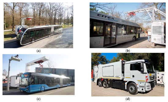IRIZAR ieTram 18 m articulated EB [] (a) IRIZAR ieTram 18 m articulated EB in Osnabrück at Waldfriedhof charging station, Type A, (b) VDL Citea SLE-129 at Waldfriedhof charging station, Type A, (c) Heuliez GX437E 18 m bus at SWO depot [], (d) MAN refuse collection E-truck.