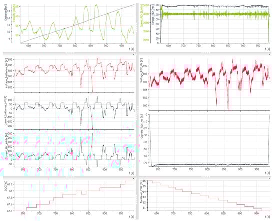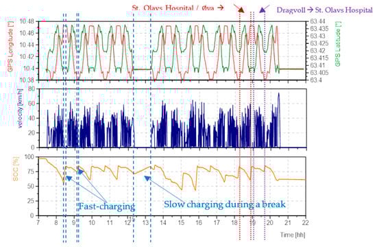 The external temperatures during the operation week vary from 6 °C to 22 °C with an average of 15 °C. Therefore, the temperatures are comparable with the autumn in Osnabrück. To get an impression of the daily routine of the bus, Figure 5 shows the GPS and the SoC throughout the day on the 15 June. The beginning and the end of the vehicle usage were at the depot. The vehicle starts with a fully charged battery. During the day, the vehicle drove between “St. Olavs Hospital/Øya” and “Dragvoll”. At the stop at both ends, the vehicle was charged via opportunity charging for around 2–6 min. The opportunity charging time differs because charging was done in the time buffer to keep to the time schedule of the route line. The average SoC is on a high level of more than 70% so that in a case of a delay, the opportunity charging time can be shortened without the risk of low energy. At midday on 15 June, there was a break of around 1 h at the depot, where the vehicle was slowly charged.