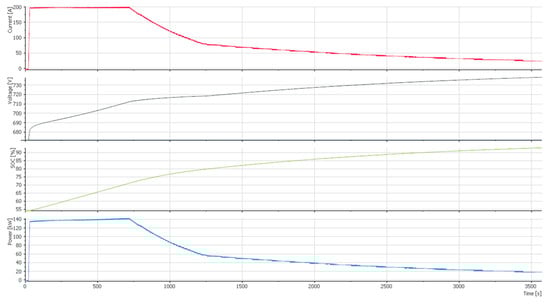 The graphs in Figure 8 show the voltage, current, SoC of the battery system, and charging power. Due to the CCS2 charging interface, the current is limited to 200 A. With increasing battery voltage above 715 V (around 72% SoC), the charging current gets derated. At this point, the maximum charging power of about 143 kW is reached.