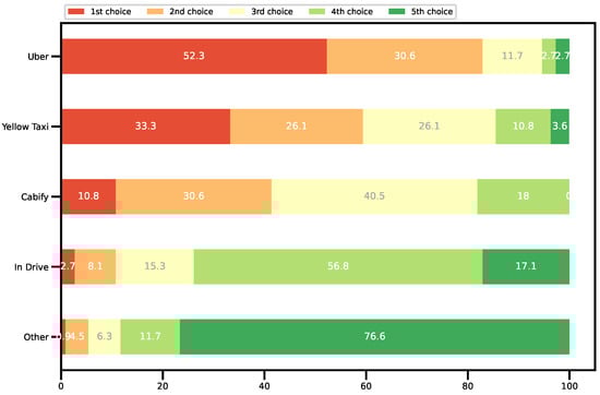 Figure 1 depicts the bar chart of the customer preferences related to the kind of service for taxis. Note that Uber is the taxi service that is preferred by most of the respondents with more than a half of the respondents that selected it as their first choice. This is because in Quito this taxi app is now widely used and many users like this service due to the security that Uber offers. Moreover, it can be seen that the other taxi app services are not much used.