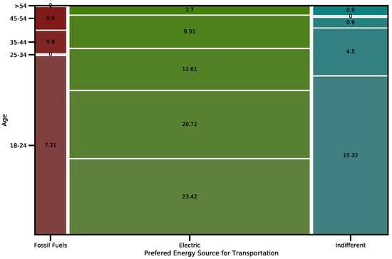 In Figure 2, a mosaic plot considering the age and the preferred type of energy use for transportation is illustrated. Observe that people that are between 25 and 34 years old are more sensitive to preferring electric public transportation. On the other hand, there is a significant proportion of people between 18 to 24 years old that do not care about electrified public transportation or prefer it to be powered by fossil fuels. There were no statistically significant differences in concerns based on genre.