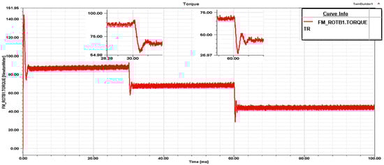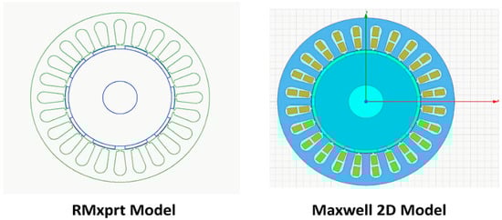 The PMSM model was first developed using the Ansys Electronics Desktop Suite magnetic circuit method. RMxprt enables rapid implementation of basic motor design and performance evaluation, reduction in the motor’s design space, and development of the motor’s Maxwell two-dimensional (2D) finite element model, as seen in Figure 1. Maxwell is a rotary motor design software solution that is capable of quickly calculating the performance indicators of a variety of motors (synchronous motors, induction motors, mechanical, or electronic commutation motors, etc.). In the process of using RMxprt, the user should specify the motor’s stator and rotor diameter, slot, iron core length, insulation, winding, and some other related parameters, as well as the size of the permanent magnet with the material type []. PMSM design involves a variety of parameters, including electrical (inductance, resistance, back emf, and current), geometric (outside/inside radius of rotor, outside/inside radius of stator, and stator back) and magnetic. While designing, some parameters must be fixed, which is under the control of the designer. After observing the motor for varying stack lengths, top tooth widths, rotor structures, and steady state characteristics, the design is optimized. Design calculations were performed using the motor’s specified rating and a few assumptions. Additionally, the user defines boundary conditions and mesh division (the software’s automated meshing is very rough, resulting in inaccurate calculation results) to accomplish the desire for increased efficiency. Finally, the Maxwell model is imported to the Ansys Electronic Desktop platform for further processing and co-simulation [].