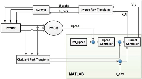 Finally, after developing the speed and current control circuits in Simulink, a co-simulation between Twin builder and Simulink is established for the purpose of implementing and simulating the overall motor drive control system. A co-simulation is simply a connection between the software packages ANSYS and MATLAB that enables the flow of data and system control between the two packages. To run the co-simulation effectively, continuous data exchange across all of the individual components (Twin builder, Maxwell and MATLAB models) is required. The interface between Ansys and Simulink was established and implemented using a predefined “S-function” found in the Simulink component library provided by ANSYS. The S-function’s objective is to receive d- and q-axis currents and motor’s speed from Maxwell motor model, and to transfer d- and q-axis voltages to the inverse park transformation in Twin builder. It functions as the data interface between Twin builder and MATLAB since there is not any direct data exchange among Ansys-Maxwell and MATLAB. The Simulink control structure was then exported to Twin Builder as seen in the complete model of Ansys and Simulink control structure in Figure 5.