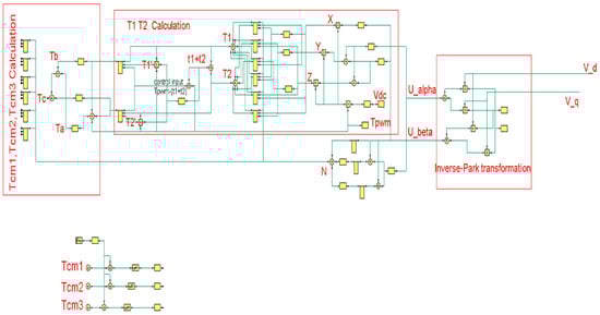 This results in the motor achieving a rotating magnetic field, resulting in high efficiency. Four major sub-modules comprise the SVPWM module, as follows: the main vector’s operating time calculation, the sector judgment, and the triggering pulse generating and switching point calculation, as shown in Figure 3.