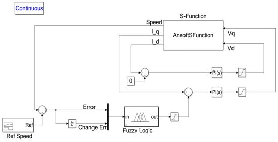 In the MATLAB/Simulink environment, we developed a double closed-loop system for controlling the motor’s speed and current signals, which is composed of fuzzy logic (FL) and a proportional integral (PI) regulator, as shown in Figure 4. For PMSM control, the PI field-orientation control technique is very common and useful. However, an advanced motor controller is required to achieve high performance and system stability and robustness. The FL controller has been increasingly implemented in complicated control systems in today’s technologies []. The FL controller was developed with two inputs and one output. Current in axis d (Id) was kept to zero in this paper, thus we used the FL controller to get the reference current value in axis q (Iq,ref), which were then compared to the actual Iq values in order to get the voltage in axis q (Vq) values. In the FL controller, the inputs are as follows: speed error “Error”, change in speed error “Change Err”, and an adjusted output control ”Control” using control rules. There are five membership functions for input variables, as follows: “Error”:—Very low, Medium Low, Zero, Medium High, Very High. Besides these, there are also two further membership functions for input variable, as follows: “Change Err”:—Positive High and Negative High.
