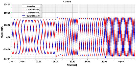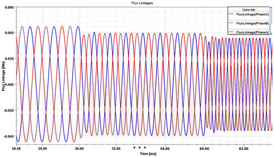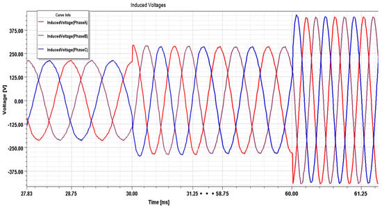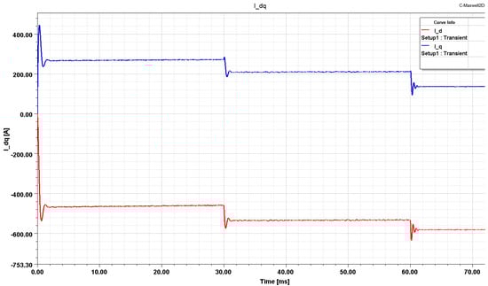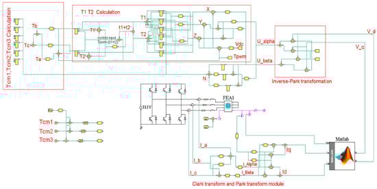 The basic idea of the control principle is by using a coordinate transformation to obtain two orthogonal components, field current (Id) and torque current (Iq). Electromagnetic torque is mainly generated by torque current, and adjusting field current will change the air gap magnetic field []. Six IGBT switches and six stream diode modules form the output signal in the three-phase PWM inverter. The generation of control signals in a PWM inverter control circuit is achieved by comparing it to a triangle signal, with the same period to the switching period, through the SVPWM control module. Due to the inability of a two-dimensional Maxwell motor model to incorporate phase winding resistance Rs and concentrated phase end-winding inductance “Lend,” these components are added in the Twin builder model along with the PWM inverter.