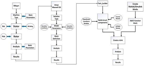 Such a simulation approach will be useful for detailed modeling with higher accuracy and system optimization. First, the Simulink– Twin builder co-simulation is achieved by adding (link to) a sub circuit of Simulink component to Twin builder circuit, where the results of the simulation are displayed in the graphical environment of Twin builder. Secondly, MATLAB’s S-Function (provided by the Ansys Software Manufacturer) is created with the required name ‘AnsoftSFunction’ in Simulink using the Sim2Sim link interface. The S-function’s objective is to receive d- and q-axis currents and motor’s speed from Maxwell motor model, and to transfer d- and q-axis voltages to the inverse park transformation in Twin builder. It functions as the data interface between Twin builder and MATLAB since there is not direct data exchange among Ansys-Maxwell and MATLAB. The overall flow chart of the co-simulation of these software tools is shown in Figure 6.