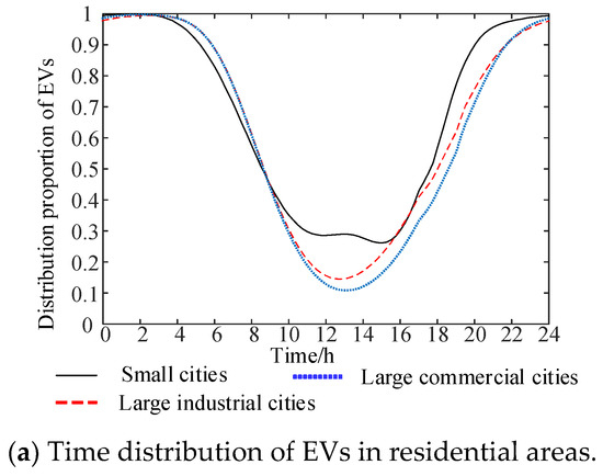 Costs of the distribution network and benefits of EVs are demonstrated in this table. Cost of the network is the optimal result of target function (20). EV benefits (or arbitrage) in total, as well as benefits in different functional areas are achieved through calculating the difference between cost and profits of EVs in the corresponding areas. Note that the cost of the distribution network is lower, and the benefit of EVs is higher in small cities relative to the two large cities. This is because the higher proportion of EVs in residential and working areas can take full advantage of the peak–valley electricity pricing system. Industrial cities are second for both costs and benefits. EVs in commercial cities have the highest cost and the lowest profit because they have more entertainment trips. There is a large amount of randomness in the E–H trip and a short stay time in the commercial area; EVs are mainly charged in the commercial area, thus limiting the efficiency of the V2G strategy for EVs.