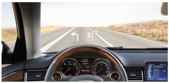 The HUD display content in the human–computer interaction information interface design of an IEV is located in the driver’s driving field of vision, and the display information is fused with the real information. Therefore, the information function design of HUD display should not only meet the needs of the driver’s main driving task, but also ensure that the information is concise, intuitive and easy to read, so as to prevent the driver from cognitive overload. The driver’s focus in the driving process is the road situation in front of the line of sight, and the human–computer interaction information related to the main driving task is the vehicle equipment and vehicle driving situation. In this design, the HUD interface functions include vehicle speed information, steering reminders, and road condition information.
