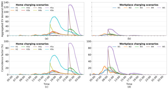 - Bollerslev, J.; Andersen, P.B.; Jensen, T.V.; Marinelli, M.; Thingvad, A.; Calearo, L.; Weckesser, T. Coincidence Factors for Domestic EV Charging From Driving and Plug-In Behavior. IEEE Trans. Transp. Electrif. 2022, 8, 808–819. [Google Scholar] [CrossRef]
