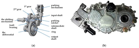 The two-speed transmission prototype and the internal structure of the transmission are shown in Figure 2a,b, respectively.