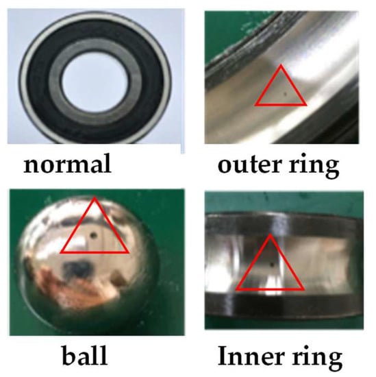 In order to simulate different pitting states of bearings, electrical discharge machining technology is used to prefabricate 7 types of bearing faults, including single pitting failure of inner and outer rings and rolling elements, composite pitting failure of inner and outer rings, composite pitting failure of inner ring and rolling elements, composite pitting failure of outer ring and rolling elements and normal bearing. Among them, the diameter of the severe pitting fault is 0.53 mm, the diameter of the composite fault is 0.18 mm, and the depth is 1 mm. Bearings with different fault types are shown in Figure 4.