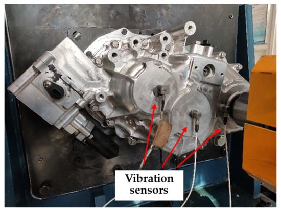 During the experiment, different rotational speeds and torques were set for the driving motor. The rotational speeds of the input end were 1965 r/min, 2088 r/ min, 2228 r/min and 2366 r/min, respectively, and the torque was 32 Nm. The speed and torque of the input end and output end were fed back in real-time through the speed sensor and torque sensor on the bench. Sensors were arranged on the housing to collect vibration signals from the bearings on the input shaft and the intermediate shaft, as shown as Figure 5.