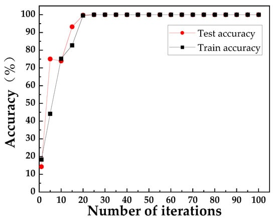 It can be seen from Figure 8 that after 18 iterations, the training accuracy and testing accuracy of the model reached more than 95%. When the number of iterations reached 20, the training and testing accuracy were all 100%. Although the original signal was mixed with noise with a low signal-to-noise ratio, the method adopted could still accurately extract effective feature information from the rolling-element bearing vibration signals with different fault modes, and could identify different fault types quickly and with a high accuracy.