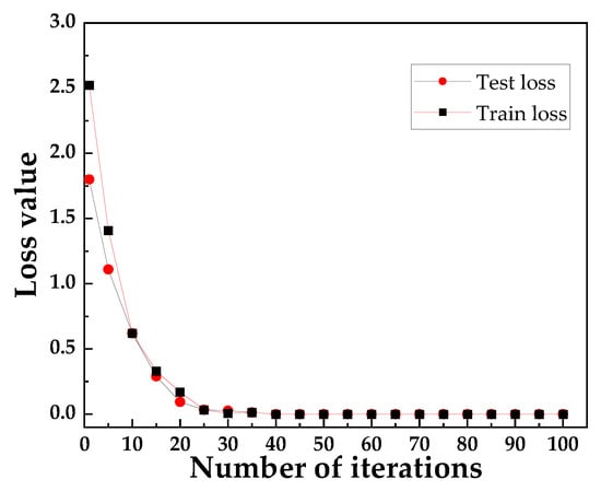 When processing the bearing vibration signal, the local coverage method was adopted to make the two adjacent groups of data overlap partially and to improve the generalization ability of the model. After model iteration 100, the training and test results of the fault types were as shown in Figure 8, and the loss value change curve is shown in Figure 9.