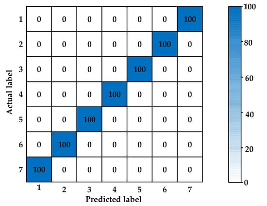 The results of several groups of experiments showed that the bearing fault identification model adopted in this paper could be applied to the pattern recognition of rolling-element bearings with different fault types under continuous variable speed conditions, and an excellent classification effect was achieved. The classification confusion matrix is shown in the Figure 10.