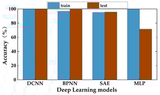 Among other models, BPNN and SAE have also achieved high recognition accuracies, but took a long time. Their classification accuracy was found to fluctuate in the process of adjacent experiments, and the stability of the model needs improving; the test accuracy of the MLP model was low, less than 80%, and its classification results were related to the number of training sets and test sets. When the data sets were small, the classification results of the model were not ideal and the classification accuracy was not high enough, indicating that the applicable conditions of the model had certain limitations.