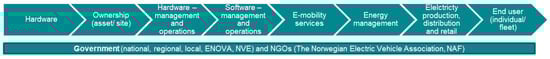 Wangsness and Figenbaum [3] found that more than 40 business models within the seven parts of the EV charging value chain shown in Figure 1 are currently practiced in Norway. They provided a qualitative evaluation of these business models according to their profitability, scalability, and contribution to the public charging infrastructure, which were the parameters also used by Spöttle et al. [38]. Seven business models were highlighted as particularly interesting, with typical actor examples in parentheses: