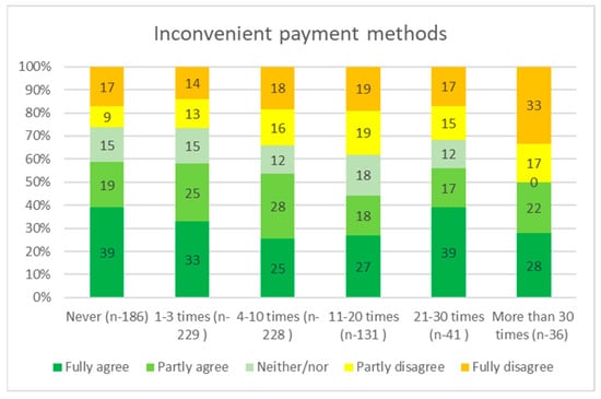 Distribution showing BEV owners’ level of agreement to the statement “I find payment solutions at fast-charging stations inconvenient”, according to the number of times the respondents have used public fast chargers the last 12 months (n-851).