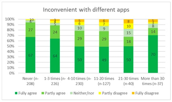 Distribution showing BEV owners’ level of agreement to the statement “It is inconvenient when charging operators operate with different apps”, on the basis of the number of times the respondents used public fast chargers the last 12 months (n-868).