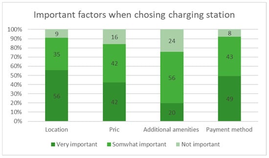 Figure 4 shows how BEV owners consider the importance of different factors when choosing a charging station. Location and payment methods were considered the most important factors, but price and amenities were also important. About 75% agree that amenities at fast charger stations are important (the question did not differ between the charging stations located in the cities or along main roads connecting cities). The availability of amenities was more important at stations typically used by long distance travelers.