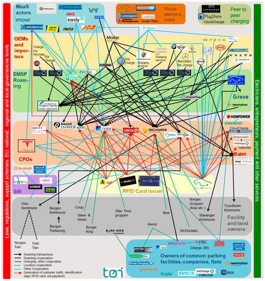 The ecosystem was also systemized as a functional map that shows the monetary and co-operative interactions between the different actors and actor types, e.g., CPOs, EMSPs, land and facility owners, MaaS actors, RFID card issuers, software suppliers, and owners of common parking facilities (public facilities as well as private parking facilities for flat owners). The map provides a holistic view of the Norwegian charging infrastructure ecosystem. It was built up by analyzing data from reports, press articles, and open sources.