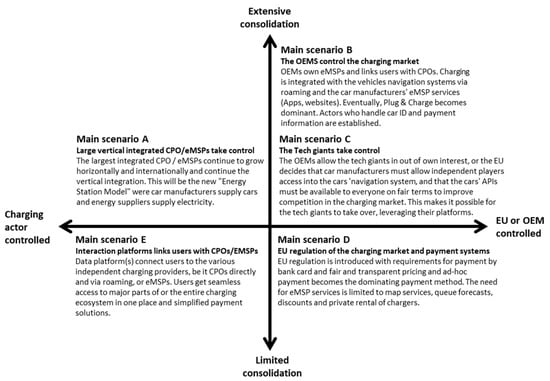 The five most likely scenarios (the authors’ assessment) were analyzed further, as shown in Figure 6, and differentiated across the degree of consolidation in the market and whether the market development is steered from charging actors or external actors. The customer experience compared to BAU will improve to a variable degree in these scenarios. It can be useful to have a mix of main scenarios A and B in mind when making a strategy in the BEV charging infrastructure ecosystem, as these scenarios exemplify outcomes of the battle between the large integrated CPOs/EMSPs and OEMs regarding the control of the charging market. Both of these types of actors need to be aware of the snowball effect of an increasing number of players and platforms offering e-roaming connected together by network orchestrators and interaction platforms as in scenario E. Tech giants can also be in the lead if they gain access to the navigation systems/vehicle displays as in scenario C. Better customer experiences can also be achieved through regulation of the market as in scenario D. EMSPs can in scenario D become less needed if fair pricing is required for drop-in customers and if unified payment systems that do not require user registration become mandatory. Authorities may need to pursue such regulations if the market actors themselves cannot establish an overall acceptable customer experience, through voluntary roaming, co-operation, or consolidation.
