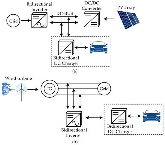 (a) EV charging system with PV array and grid, and (b) WTG-EV battery charging system. Adapted from [19,20].