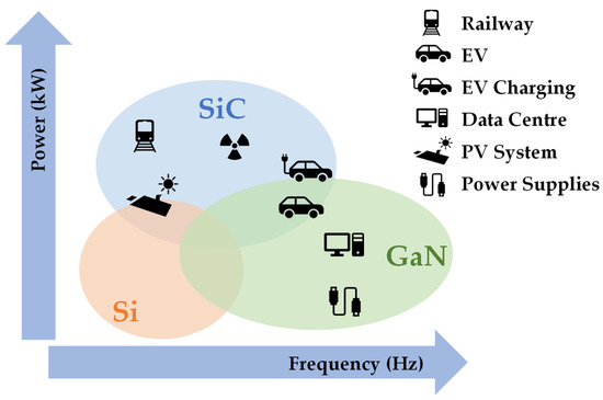 On the other hand, wide band-gap (WBG) semiconductor technologies such as silicon carbide (SiC) and gallium nitride (GaN) recently have received increased attention for their superior characteristics [36,37,38,39,40,41], as Figure 3 [42] shows. Specifically, applications such as electric vehicles (EVs) demand that WBG semiconductors meet their stringent specifications [42].
