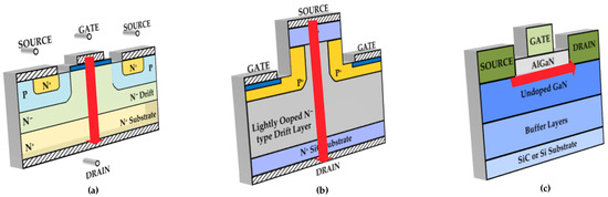 The structures of (a) Si MOSFET, (b) SiC MOSFET, and (c) GaN HEMT. [46] Adapted from [46,47].