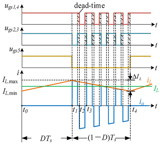 As shown in Figure 6, the CSI was operated in switching period Ts corresponding to the frequency fs of S5, and S1–S4 operated at a higher frequency fsw to produce bipolar pulses. The D denotes the duty cycle of S5. Under this operation scheme in Figure 6, four circuit stages of the inverter are shown in Figure 7. It also shows the current flow in each mode.