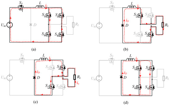 As shown in Figure 7a, when S1–S5 were ON and the freewheel diode was OFF, the inductor was charged by the input DC source. Because S5 was modeled as an ideal switch, there was no voltage across it. The circuit voltage equation based on KVL is: