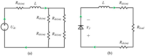 This section proposes a precise model where the MOSFETs were modeled as a constant resistor Rds(on), and on-state and freewheel diodes were modeled as a constant voltage drop VF in the on-state. They were both modeled as an open circuit in the off-state. The equivalent circuit of the charging and discharging states are shown in Figure 8.