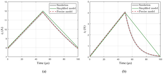 The comparison of the inductor current waveforms between simulations, the simplified model, and the precise model: (a) when Rload = 10 Ω, and (b) Rload = 100 Ω.