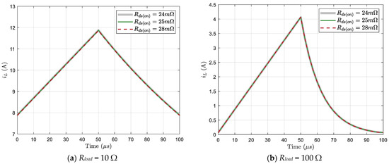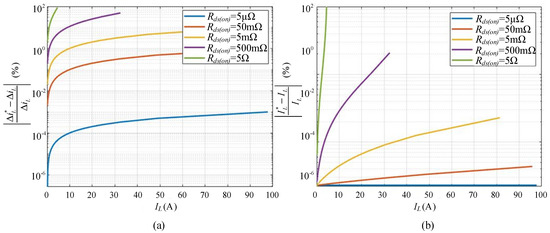 The error of the inductor current ripple ΔiL and the inductor average current IL solved by the proposed two models are shown in Figure 10, where IL* and ΔiL * were solved by the simplified model, and IL and ΔiL were solved by the precise model. As shown in Figure 10, the error between these two models increased with the increase of IL, and the error was positively correlated with RDS(on). The error of IL and ΔiL were both within 10% when Rds(on) was less than 500 mΩ and IL was less than 30 A. When the Rds(on) of the MOSFETs was smaller than one milliohm of resistance, the error of IL and ΔiL were both less than 5%.