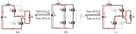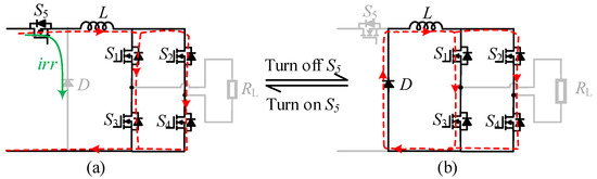 As shown in Figure 7b,c, S5 was always OFF in this stage, and S1, S4 and S2, S3 were two pairs of switches operating in complementary control. Since the freewheel diode and S1–S4 were modeled as ideal switches, the circuit voltage equation based on KVL is: