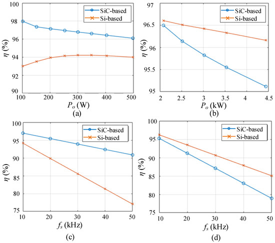 The power efficiency comparison between the SiC- and Si-based CSIs: (a) the power efficiency versus the output power (when fs = 10 kHz, Udc = 100 V); (b) the power efficiency versus the switching frequency (when Rload = 20 Ω, Udc = 100 V); (c) the power efficiency versus the output power (when fs = 10 kHz, Udc = 400V); (d) the power efficiency versus the switching frequency (when Rload = 20 Ω, Udc = 400 V).