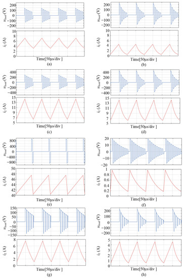Simulation results: (a) Udc = 100 V, Rload = 20 Ω, D = 0.5; (b) Udc = 100 V, Rload = 50 Ω, D = 0.5; (c) Udc = 200 V, Rload = 20 Ω, D = 0.5; (d) Udc = 200 V, Rload = 50 Ω, D = 0.5; (e) Udc = 100V, Rload = 20 Ω, D = 0.9; (f) Udc = 100 V, Rload = 20 Ω, D = 0.1. The reflex charging mode simulations: (g) Udc = 100 V, Rload = 20 Ω, D = 0.5 and (h) Udc = 100 V, Rload = 50 Ω, D = 0.5.
