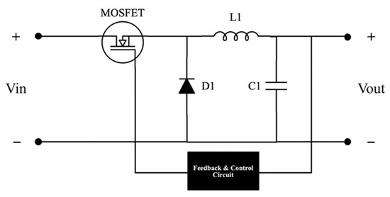 Typical energy storage systems operate at a fixed bus voltage value. The bus voltage value of the system is 24 V. Therefore, stepping down and regulating the system’s input and the output voltage is necessary. A buck converter is chosen for simplicity. The input side buck converter feeds power to the electrolyser, while the output side buck converter feeds the load. The selection of buck converter parameters is based on its input and output voltage values. The inductor and capacitor values for the buck converter design were derived from Equations (1) and (2) [46]. The circuit is designed in a closed-loop structure to get a stable and reliable output. The equivalent circuit diagram of the buck converter is depicted in Figure 2.