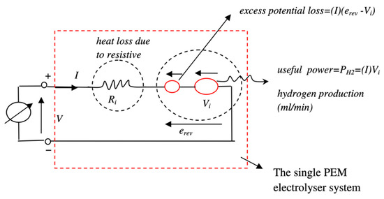 For the modelling of the electrolyser, the equations describing its operation are derived from thermodynamic aspects. However, the formulas governing the operation of an electrolyser are rather simpler. They are obtained from Faraday’s laws of electrolysis. An equivalent circuit of a required electrolyser is modelled using the mathematical equations in MATLAB® Simulink®. The equivalent circuit of the electrolyser is shown in Figure 3. The expected output from the electrolyser is the hydrogen production rate, given in Equation (8) [13]. The amount of hydrogen produced by the electrolyser depends on the current drawn by the electrolyser and the molar volume of hydrogen. The formula for molar volume is given in Equation (9):