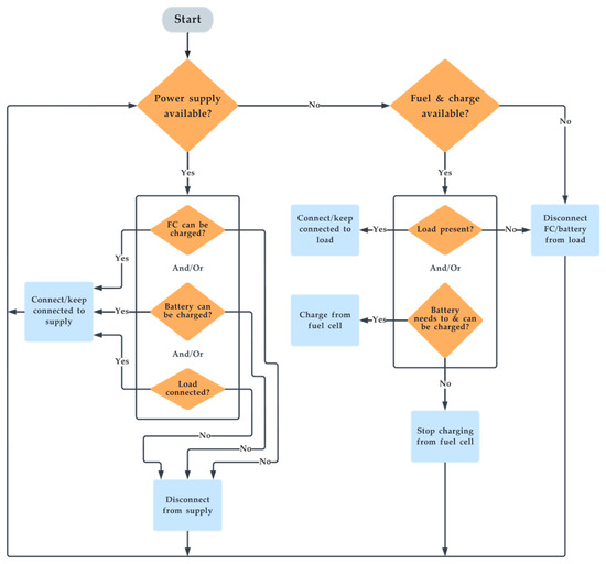 The control algorithm governs the system’s operation. The system’s algorithm is pictorially depicted as a flowchart in Figure 4. In total, 13 unique cases are derived as a permutation of unique cases from Figure 4. Based on the availability of power supply and load, the switching ensures optimal charging and discharging for all cases of operation. To do this, the system has four switches: at the input side of the electrolyser (EL), at the output side of the fuel cell (FC), at the input side of the battery charging circuit (BI), and at the supply to load connection circuit (IL). These four switches are turned on/off based on a unique combination sent by the ”control algorithm” block. To produce this unique set of Boolean codes, the system reads four different parameters in Boolean format to identify the current case of operation. The four input parameters are the detection of power supply availability (IN), detection of load (OUT), H2 fuel availability (FS) and battery SOC (BS). The unique output code for each case along with input and output Boolean parameters are illustrated in Table 1. The novelty in the algorithm is that it controls the charging of the system, simultaneously supplies the load when there is a power supply, and smartly recharges the battery with the fuel cell if it can, even in the presence of a load.