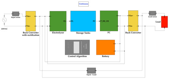 We focus on designing a mathematical model of the proposed system using MATLAB® Simulink®. The result is the combined system’s mathematical model, which includes an electrolyser, fuel cell, necessary hydrogen, oxygen, and water tanks and the parallel control algorithm modelled in the simulation.